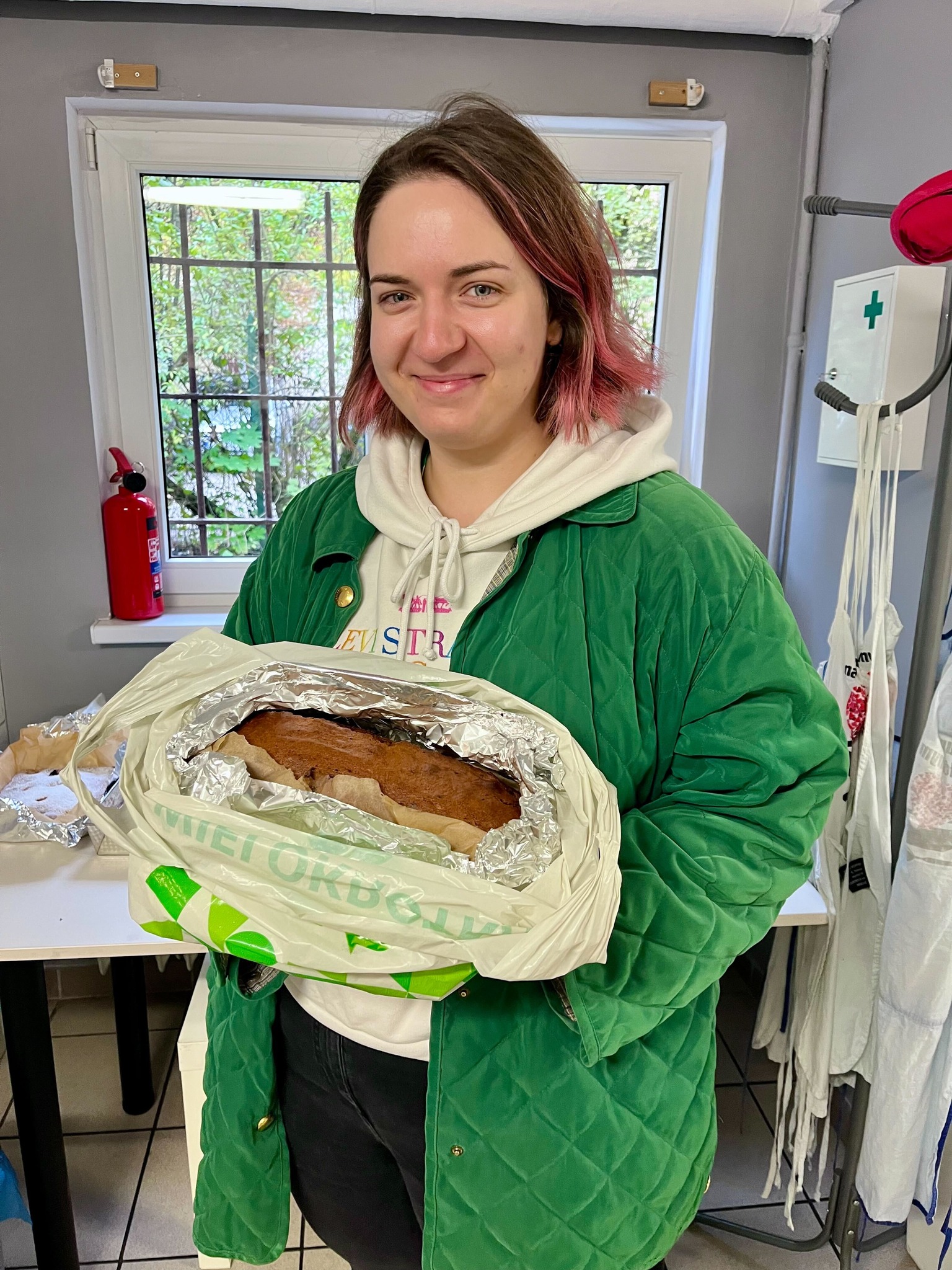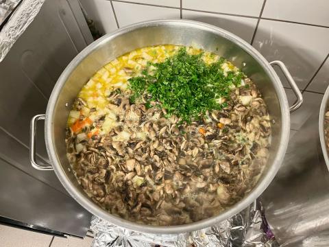 Ugotowaliśmy zupę pieczarkową – nie brakowało pracy przy krojeniu warzyw: marchewki, pietruszki, selera, ziemniaków, pora i oczywiście pieczarek. Wszyscy działali jak mróweczki. Skończyliśmy szybciej, niż ugotowały się warzywa. Dzięki temu był czas na kawę, ciasto, rozmowy i chwilę odpoczynku. Zjedliśmy zupę, spakowaliśmy auto i wybraliśmy się na dworzec.