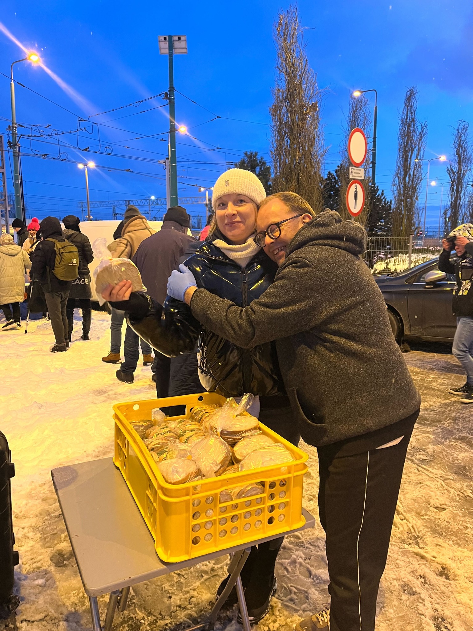 W czasie kiedy gotowaliśmy zupę, Jacek montował lampy na naszym nowym magazynie, a kilku chłopaków przewiozło tam rzeczy, które otrzymaliśmy, żebyśmy mogli w najbliższych dniach przygotowywać z nich paczki. Marzłyśmy z Gosią zapisując długą kolejkę osób. Wiele osób pokazywało nam przemoczone, dziurawe buty, czy podarte, cienkie kurtki. Wrócimy do domu, ogrzejemy się i postaramy się pomóc tym, którzy nie mają takiej możliwości, szykując dla nich ciepłe i suche ubrania. Temperatury w nocy spadają poniżej -10 stopni. To bardzo ciężki czas dla tych, którzy nie mają się gdzie schronić.