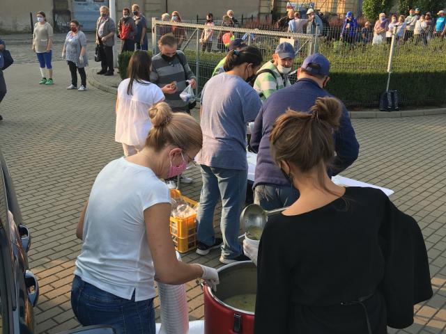Dziś zapowiadało się sporo pracy dla niewielu osób, ale na szczęście okazało się inaczej. Na zupowej grupie z wiadomościami co tydzień zamieszczamy taką ankietkę, w której można zaznaczyć, czy będzie się pomagało w przygotowaniu zupy i kanapek, czy pomoże się na PST, czy może udzieli pomocy medycznej itp. I tak jakoś wyszło, że swoją obecność zasygnalizowały tylko 3 osoby, z czego 2 tylko na dworcu. Policzyliśmy – Majster i my jesteśmy zawsze, plus Gosia, to będzie nas czworo. No cóż, jakoś musimy dać radę. Tymczasem okazało się, że wpadli do nas Chris, Kasia, Paulina i Olga, Sławek. Dotarł też Krzysztof, który miał być jedynie na dworcu. Na samym dworcu dołączyła do nas jeszcze jedna Olga. Krótko mówiąc – siły może nie były liczne, ale zupełnie wystarczające i daliśmy radę! Dziś w kuchni rządziła Wiola, a pod jej wodzą i spod jej ręki wyszła ogórkowa, że palce lizać. Tak gęsta od ziemniaków i jarzyn, że aż łyżka w niej stała. No i oczywiście z pożywną, mięsną wkładką. Śmiem twierdzić, że nasi wolontariusze gotują najlepszą zupę w Poznaniu! Oprócz tego, przygotowaliśmy kanapki i skromne paczki z łakociami. Była też kawa, herbata i lemoniada. Jednym słowem – typowe menu na zupowe spotkania. W międzyczasie zatelefonowano do nas z piekarni ByMac, która obdarowała nas kilkunastoma bochenkami pysznego chleba. Pokroiliśmy je w kromki i dodawaliśmy do ogórkowej. Przyjechał też nasz przyjaciel Andrzej, który jak zwykle zasypał nas produktami spożywczymi. Dziękujemy za pamięć!